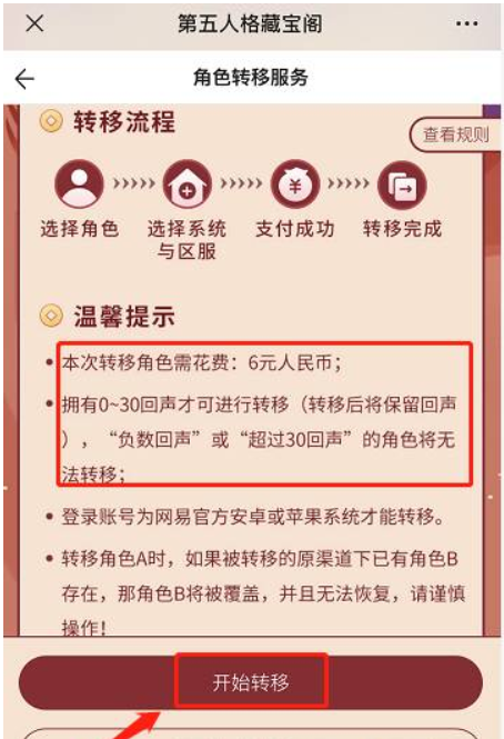 4、进人角色转移服务,点击开始转移即可。注意转移角色需要支付6元人民币,且被转移的账户中需拥有0~30回声。