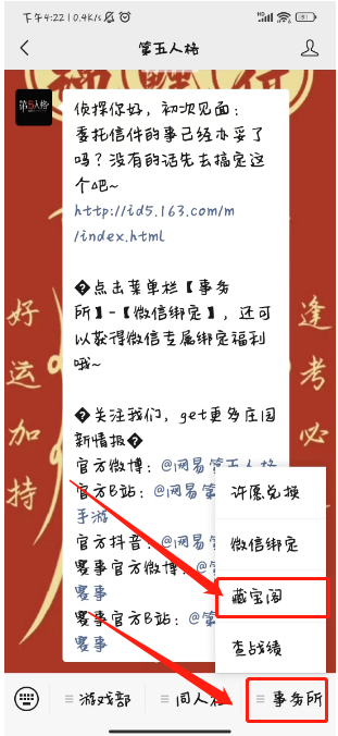 1、打开第五人格官方公众号,点击底部的菜单栏——事务所,点开第二级菜单后,点击藏宝阁。