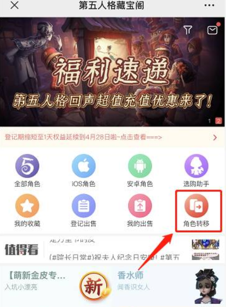 3、进入藏宝阁后,点击中间的菜单选项中的角色转移。