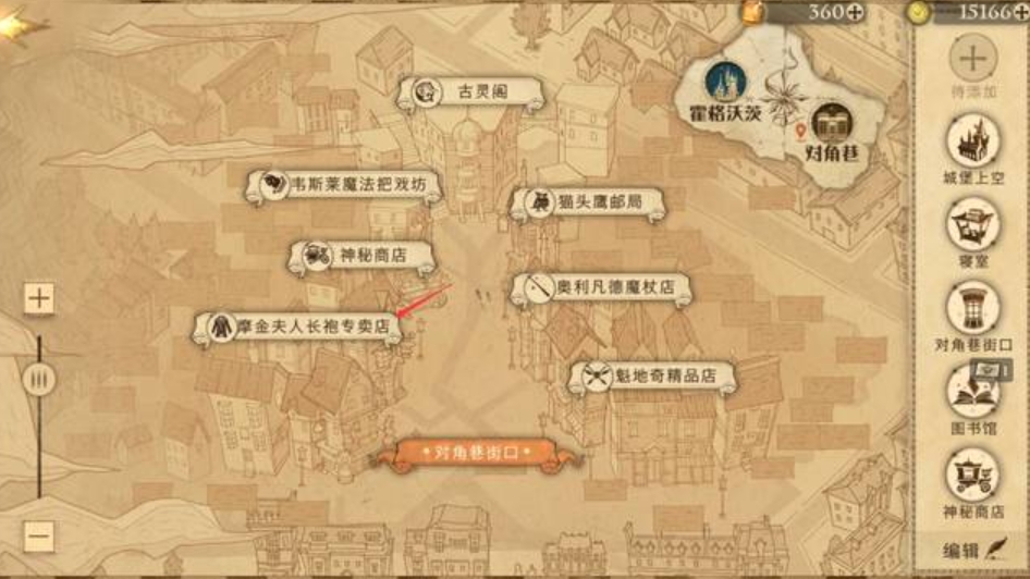 1、打开地图,选择对角巷街口,找到摩金夫人长袍店。