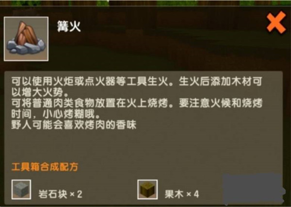 1、首先玩家需要使用2个岩石块和4个果木,将其合成一个篝火。