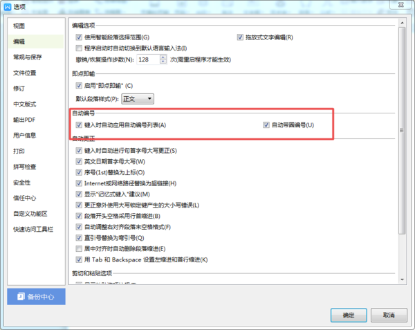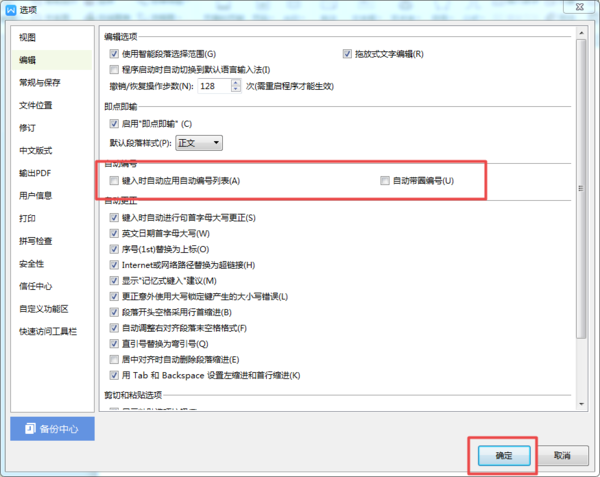第四步,接着在编辑选项所对应的界面右侧,我们找到【键入时自动应用自动编号列表】和【自动带圈编号】选项,然后将这两个选项进行取消勾选,最后点击【确定】按钮。