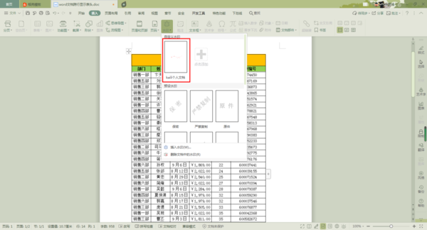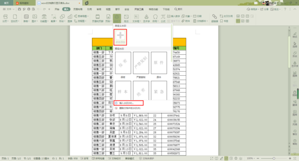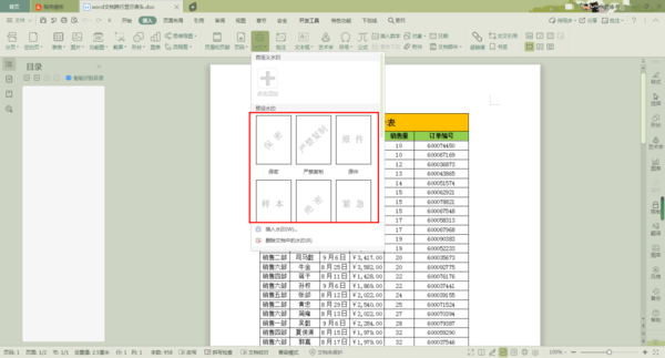 第三步,接着在插入选项卡的下方,找到【水印】功能,并点击。接着就会弹出一些水印的样式,我们可以直接点击,就可以应用到文档当中了。