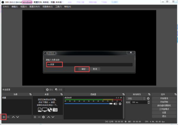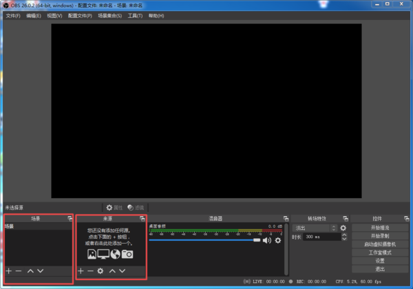 第六步,进入到OBS?Studio软件的主界面当中后,我们首先需要设置【场景】和【来源】,这里我们可以从软件底部区域的两个面板添加场景和源。