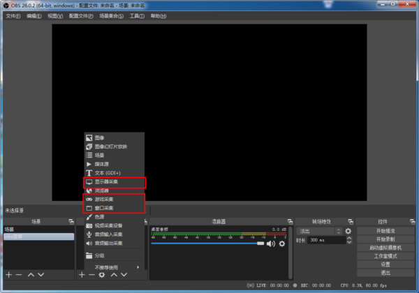 第八步,接着点击来源面板下方的【+】加号来添加源,我们可以选择【显示器采集】、【游戏采集】和【窗口采集】这个三种源。