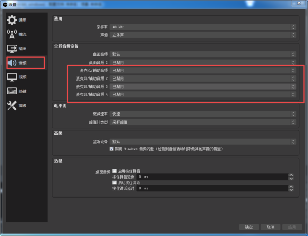 第十二步,这时,我们需要点击控件面板的【设置】菜单,然后在弹出的【设置】窗口当中,选择【音频】选项,然后将【麦克风】全部设置为【禁用】即可。最后,当混音器面板当中不出现麦克风,就表示设置成功了。