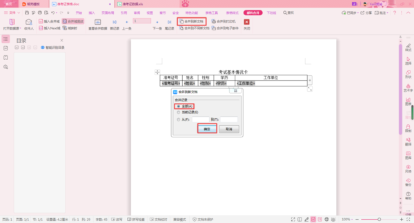 第十步,数据域全部插入完毕后,我们在软件顶部的工具栏当中,找到【合并到新文档】选项,然后点击,接着在其弹出的【合并到新文档】的提示窗口当中,将【合并记录】选为【全部】,然后点击【确定】按钮。