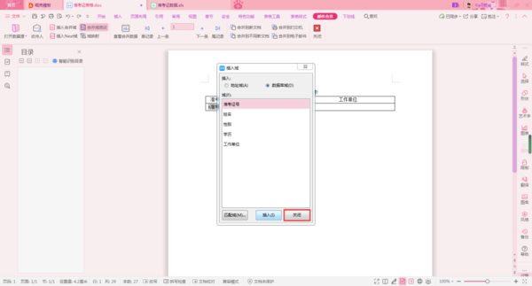 第六步,接着我们将鼠标的光标放到word文档当中需要放入数据的区域,然后点击工具栏上的【插入合并域】功能。