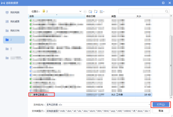 第五步,然后系统就会弹出【打开数据源】的窗口界面了,此时我们找到电脑当中的【准考证数据】表,然后点击打开。