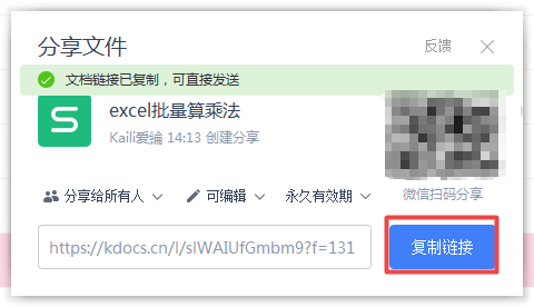 第五步,最后软件会弹出分享文件的链接窗口,我们点击窗口当中的【复制链接】按钮,然后将链接进行复制,最后将此链接发给需要分享的好友或同事就可以了。