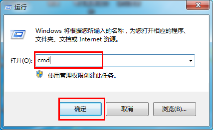 第二步,此时系统会弹出【运行】窗口,在此窗口的输入栏当中,我们输入【cmd】命令,然后点击【确定】按钮。