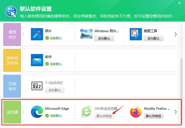 ②之后找到【浏览器】这一栏,此刻不仅可以查看当前默认浏览器,且能够直接选择其他“电脑上已有”的浏览器,并设置为默认,甚至可以牢牢锁定住,不怕其他软件恶意修改默认浏览器!