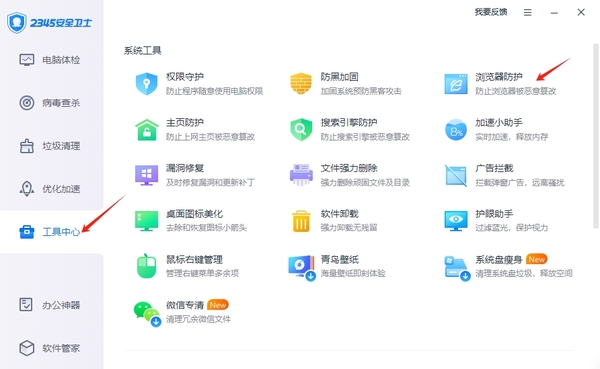 ①在2345安全卫士中,我们需要依次点击【工具中心】→【浏览器防护】;