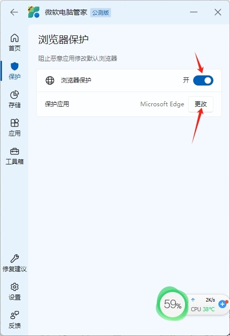 ②接着,我们需要先打开浏览器保护,之后才可以选择默认浏览器并进行防护,以图为例,小编这里选择edge浏览器作为默认,并进行保护。