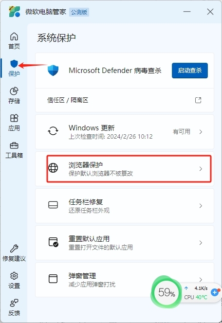 ①点击微软电脑管家左侧【保护】按钮,之后点击其中【浏览器保护】按钮;