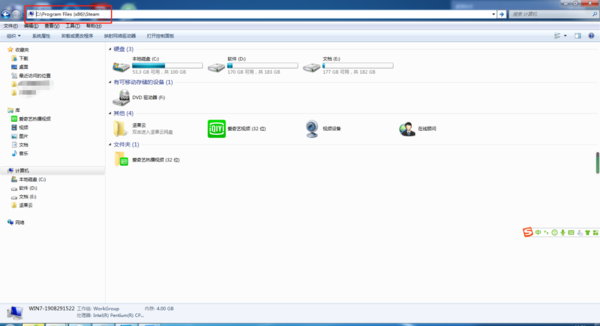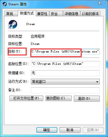 第二步,然后在弹出的【steam属性】窗口当中,我们找到【目标】一栏,这里面的位置就是steam程序的安装位置了。将此路径进行复制,然后粘贴到计算机界面当中,然后按下回车键。