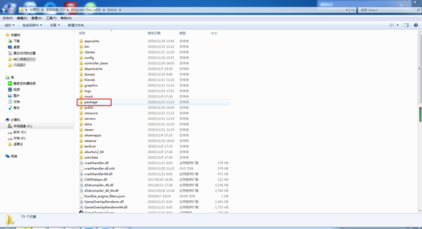 第三步,进入到steam程序的安装目录当中后,我们在这个文件夹当中,找到一个叫【Package】的文件夹,然后将其打开。