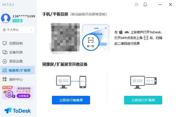 todesk这款远程控制软件,凭借其丰富的功能、出色的使用体验,以至于受到很多用户信赖,其中的投屏功能也是非常出色的,而且操作也很简单:只需分别在电脑和手机(安卓/iOS均支持)中下载并打开todesk,然后用手机端扫描电脑的二维码,就能快速投屏了,特方便。此外,todesk还拥有镜像屏、扩展屏等屏幕类功能,给日常办公提供无限可能。