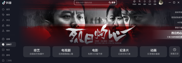 《烈日灼心》可以在抖音免费观看,很多人都不知道,打开电脑抖音客户端,在左侧放映厅即可找到这部影片,或者直接在上方搜索“烈日灼心”即可。