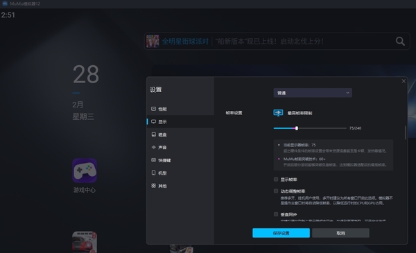 mumu模拟器运用了独特的技术,将帧数上限从60提升至240帧,我们可以根据电脑的情况去设置mumu模拟器的帧数限制。对此可能有的用户不太自己显示器刷新率,但是别担心,mumu模拟器会检测当前显示屏的刷新率,并提示给用户,通常情况只要将帧数限制改为与显示器刷新率相等即可。此外,这里要提醒大家:不要直接将帧数限制设置为大于显示器刷新率的数值,这样不仅会浪费资源,也可能会卡顿。