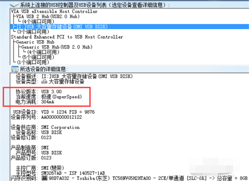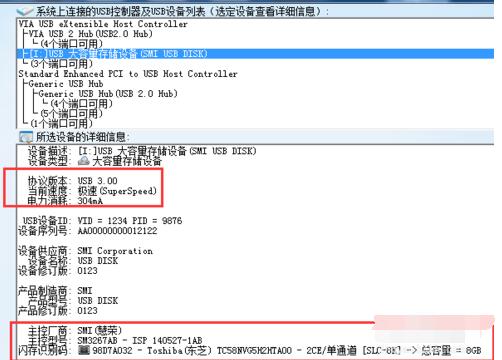 先看下这部分,这里显示出U盘的接口类型和U盘电流强度。需要注意3.0的盘若插在了2.0的口上,会显示为“2.1”协议版本。这个有点莫明其妙。