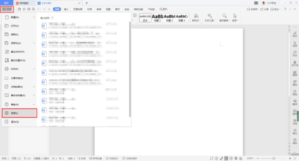 第二步,进入到新建的文档界面后,我们找到工具栏上的【文件】选项,然后点击打开,接着在弹出的选项中,选择【选项】功能,并点击进入。
