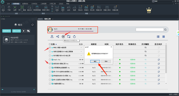 (1) 启动电脑端的浩辰CAD看图王,然后进入到云图空间当中,然后找到没用的文件或文件夹,勾选它,点击顶部的【一个圆一个叉】的按钮,这个是软件的删除选定文件夹或文件的按钮。