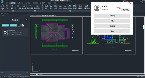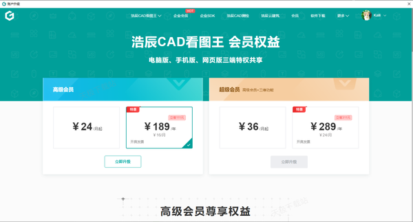 (1)启动电脑端的浩辰CAD看图王软件,登录自己的账号,将鼠标的光标放在界面顶部右上角的【个人头像和昵称上】,然后选择【账户升级】按钮。