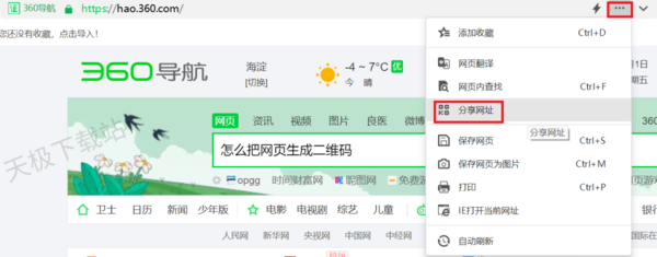 1.打开360安全浏览器,进入需要生成二维码的网页,在上方网址右方找到“三个点”,点击后选择“分享网址”。