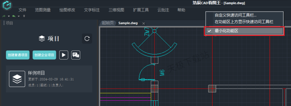 1.浩辰CAD看图王功能区其实并不是不见了只是最小化了,点击上方工具栏还是可以使用各种工具的,只不过比较麻烦。