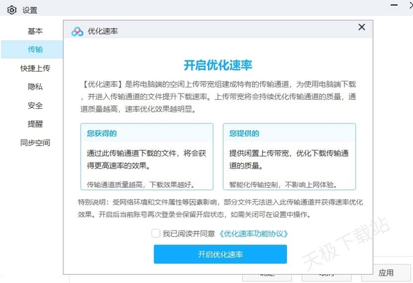 2.启用速率优化功能:速率优化功能可利用电脑端的空闲上传带宽,构建专属的传输通道,以提高从电脑端下载并进入传输通道的文件的下载速度。通过持续优化上传带宽,可以改善传输通道的质量,通道质量越高,速率优化效果越显著。只需在百度网盘设置中开启该功能即可享受到这一便利。