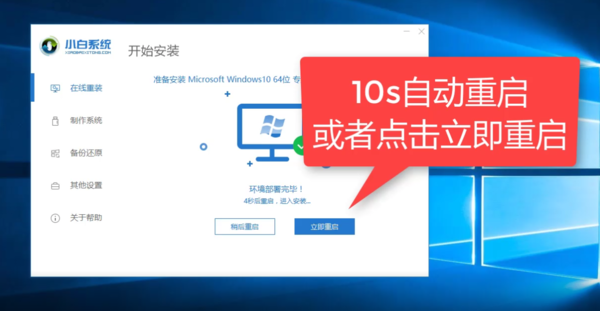 第六步,所有的东西都下载完成后,此时软件界面就进入到了安装前的系统部署以及校对了,当电脑部署完成后,就可以对电脑进行重启了。一般10秒后电脑就会自动重启,之后的流程都是自动化的,我们只需要耐心的等待就可以了。