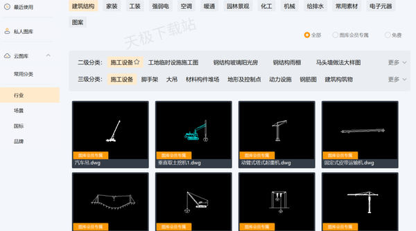 1.CAD云图库,这里包含了非常多图库资源,细分各行各业,比如建筑结构、家装、工装、化工、机械等结构图形,还有各种场景、国标、品牌资源。