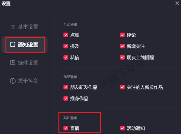 2.在此页面,点击“通知设置”,在下方找到直播通知,取消勾选即可。此页面还可以设置其他通知选项,比如作品通知、互动通知等,大家可以自行选择。