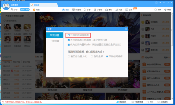 第四步,此时软件就弹出了【设置】窗口,在此窗口当中,我们找到【常规设置】当中的【开机时启动游戏库】的选项。