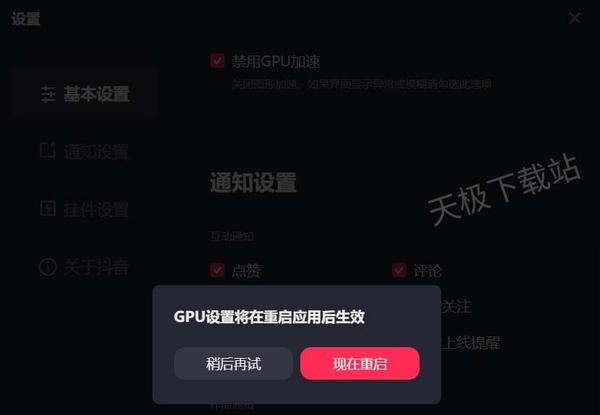 4.提升硬件配置:如果条件允许,可以考虑升级电脑硬件配置,尤其是对于处理视频播放的CPU、内存和SSD硬盘。再就是禁用抖音电脑版中的GPU加速功能,重启抖音即可。