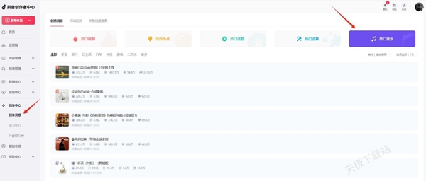 3.点开创作中心内的创作灵感,然后点击热门音乐栏目就可以查看抖音热门音乐排行榜了。
