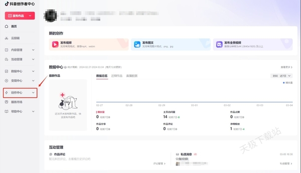 2.在创作者中心页面,我们在左边的功能栏中找到“创作中心”,点击进入。
