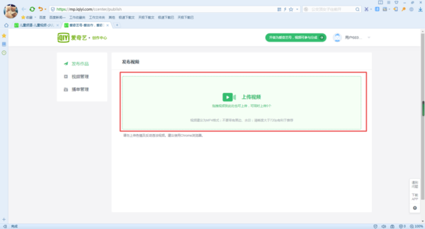 第四步,接着我们就进入到爱奇艺的发布作品界面了,在界面的中间我们可以看到【上传视频】功能,直接点击。