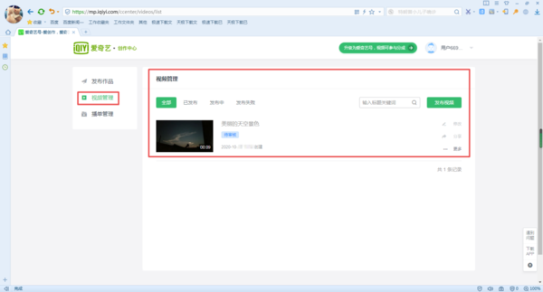 第七步,然后我们就耐心的等待视频上传和审核就可以了。同时在爱奇艺发布作品的界面的【视频管理】界面中,我们可以看到自己所上传的视频了。