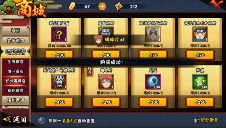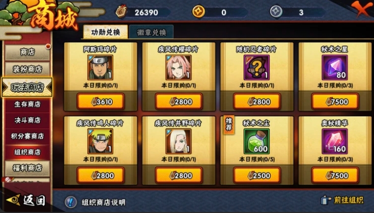 1、组合祈福,可以通过游戏内的组合系统,可以使用获得的功绩换取A级忍者或忍者碎片;