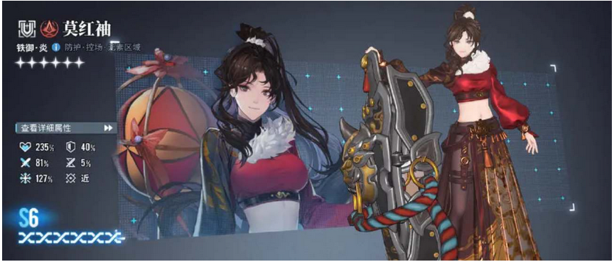 3、莫红袖:炎属性铁御,技能有减伤效果,而且在炎元素地形上能获得大量格挡值,适合搭配纯炎队、雷火队作为主T使用。