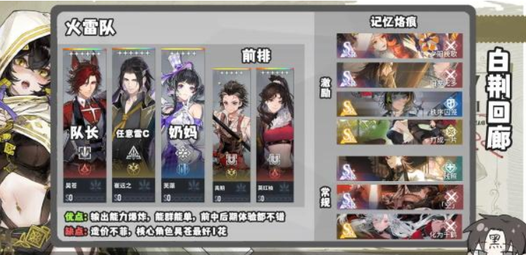3、火暴击队爆发伤害高,但是要考虑站场能力,玩家可随机带一个治疗角色如芙蕖。