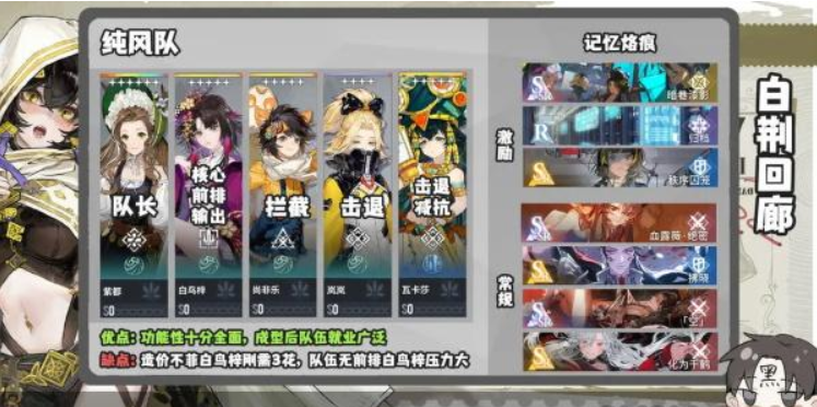 目前最泛用的纯风队一般是紫都作为队长提供高上限的队长技,白鸟梓作为核心前排和输出,尚非乐和岚岚作为功能性输出,瓦卡莎作为替补上场。如各位小伙伴所见纯风是没有坦克的,不过在拦截击退吹散方面功能性拉满。阵容核心白鸟梓十分需要叠卡,1花解锁输出封印,3花解锁坦度封印才能进化为完全体,一张3花的五星造价可不比六星便宜。另外影响纯风体系性价比的地方就是刚需ssr烙痕血露薇绝密,不过公测会送一张ssr烙痕自选也算是降低了纯风的门槛。还有一个重要因素即是纯风的激励获取十分困难,由于紫都的队长技上限极高,不推荐更换为岚岚的激励队长技,而除此之外纯风没有稳定获取激励的途径,仅有一张r烙痕归档可以通过拦截投掷物获得激励十分不稳定,因此只能通过其他角色配合永久激励烙痕获取激励例如噩梦和打成一片。如果各位小伙伴能够解决以上问题组成完整的纯风队,那我还是十分推荐的,虽然经常被偷屁股但是总体表现还是很不错的。