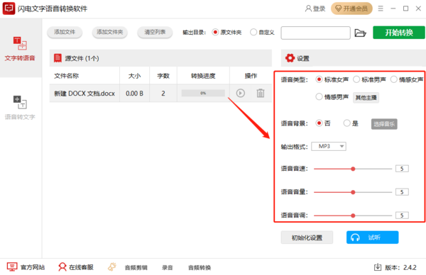 添加完成之后,在右侧我们可以对需要进行转化的文件进行设置,例如语音的类型,软件中为我们提供了很多种的声音类型,我们可以自行选择。点击下面的“试听”还可以听一下当前的效果。