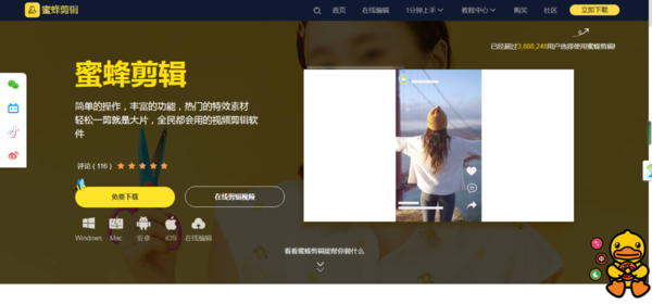 小编要推荐的第一款视频剪辑软件是蜜蜂剪辑,它是一款非常实用而且好用的视频编辑工具,这款软件支持16:9、4:3、1:1、3:4和9:16比例的视频剪辑,可以完美的适合各个视频平台,满足你的使用需求。