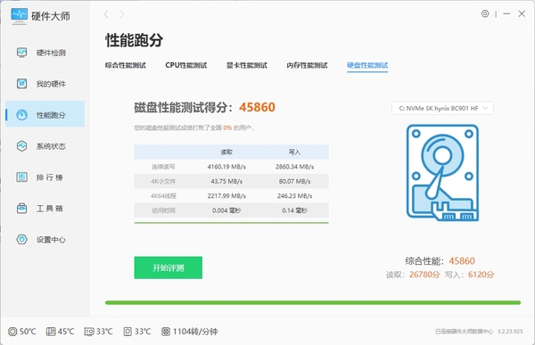 Windows优化大师中拥有简单但强大的硬盘检测功能,在这里我们可以快速检测硬盘的性能,其中有连续读写、4K小文件、4K64线程、访问时间等属性的测试。如此一来,如果我们觉得自己的硬盘能力不够强,无法满足办公所需,可以及时更换更好的硬盘。