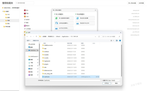 ②在360浏览器中,同样通过“收藏”菜单,找到“导入/导出”功能,选择相应的HTML备份文件进行导入。