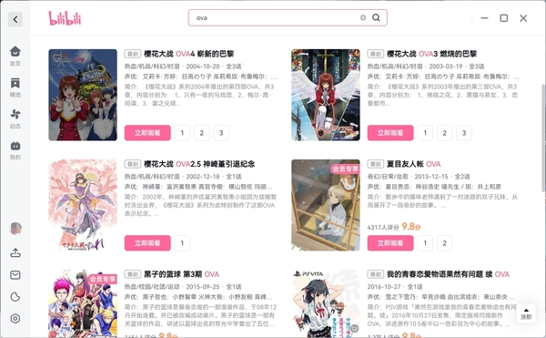 哔哩哔哩作为一款主打动漫的影视软件,其中拥有很多动漫相关作品,其中就不乏有ova,像是《夏目友人帐》、《黑子的篮球》、《灼眼的夏娜》等经典IP,都有对应的ova版本,而且ova更多都是对剧情的补充、改编,吃饭的工夫就可以追完,但是其对于剧情的理解是颇有帮助的。