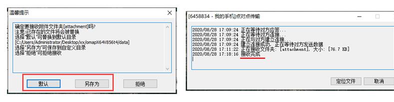 在电脑端(或对应的好友),提示“确定接收附件附件文件夹[Documents/attachment]吗?”,选择【默认】,等待提示“接收完成”,即可。